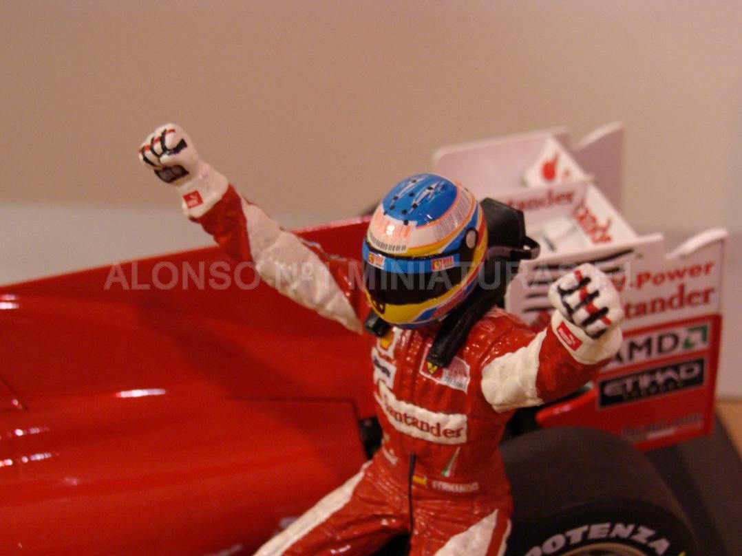 Miniatura correspondiente al Ferrari F10 utilizado por Fernando Alonso en el GP de Singapur de 2010 en la que el asturiano consiguió la victoria y su primer Grand Chelem en F1 (pole, victoria, vuelta rápida y liderar carrera de principio a fin). La particularidad más importante de la misma reside en que se trata de una especficación B avanzada del F10 con escapes bajos soplados al estilo del RB5 de Red Bull . Otras particularidades aerodinámicas llamativas son el alerón delantero con tres planos utilizado también en las carreras de la segunda mitad de la temporada, así como la ausencia del F-Duct debido a las propias características del circuito. Esta victoria confirmó a Fernando como un verdadero especialista de este circuito, donde en los tres grandes premios disputados hasta el momento ha conseguido dos victorias y un tercer puesto.
